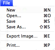 The File Menu allows you to access functions related to opening, closing, saving and printing files. Keyboard equivalents vary depending on your platform.