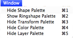 The names of the items change to reflect the current state of the palettes. When a palette is showing the command will read Hide XXXX Palette. When the palette is hidden the command reads Show XXXX Palette.